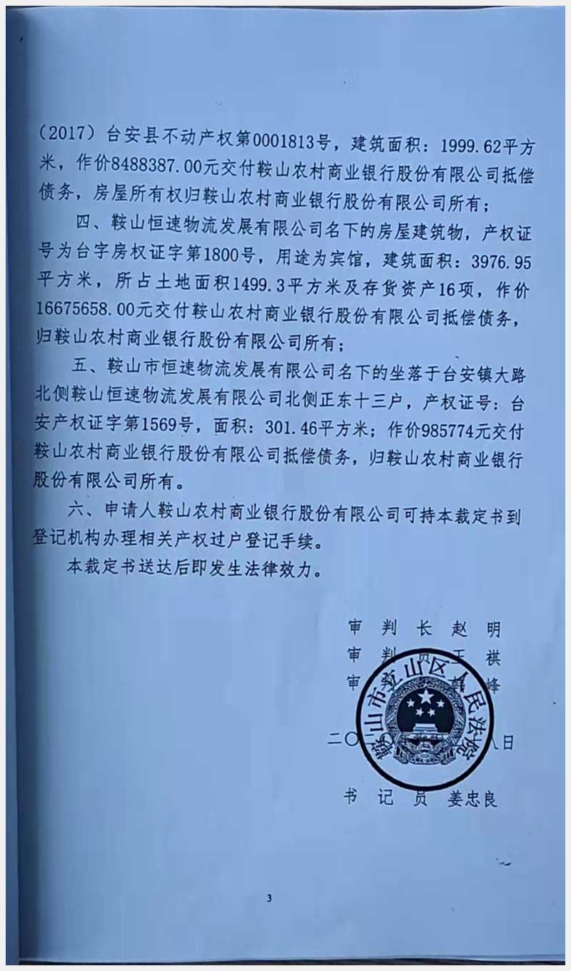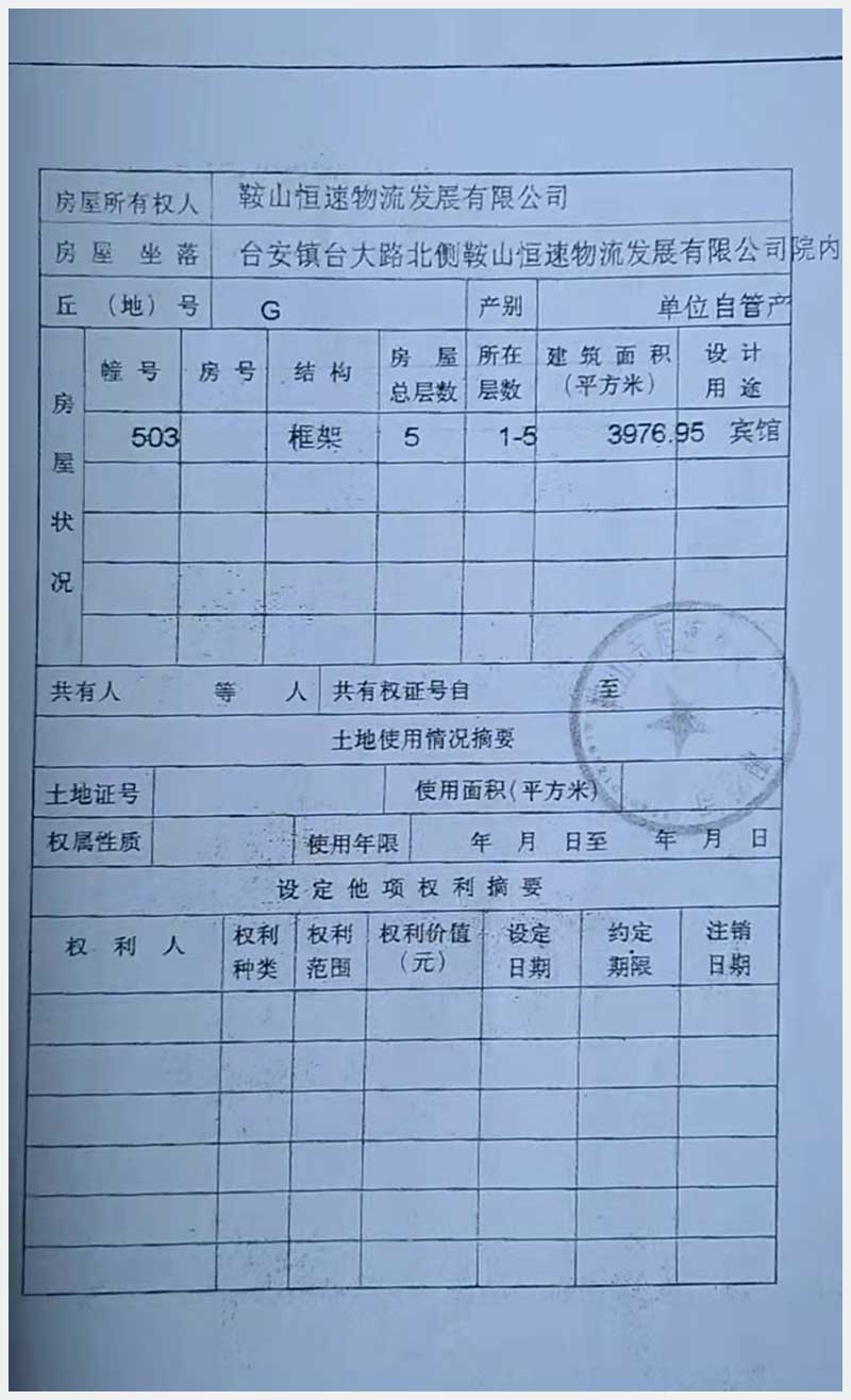 名稱:臺安縣高速路口房產臺安鎮(zhèn)臺大路北側鞍山恒速物流發(fā)展有限公司院內房產 面積:3976.95㎡ 瀏覽次數:1019